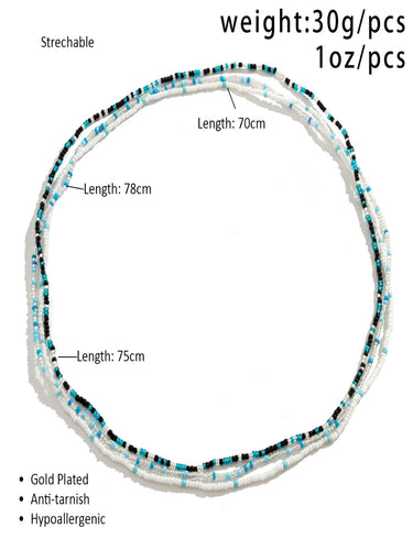 Sunshine in every step! This earthy-toned Blue stretchable beaded waist chain set of 3 is made for your barefoot beach days and breezy getaways. Stack all three for that bold boho vibe or wear them solo for a hint of laid-back charm. Either way, your hip chains are ready to shine under the summer sun.