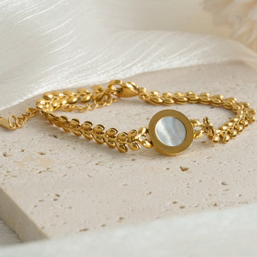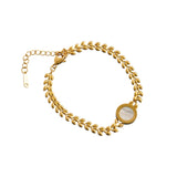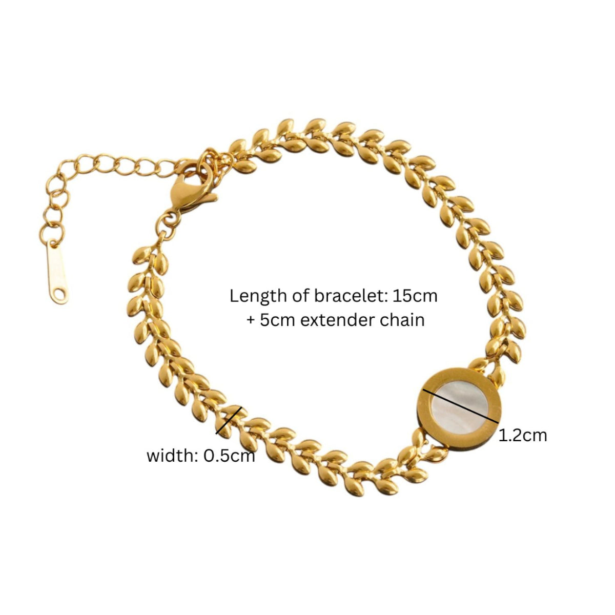 A timeless bracelet that blends natural elegance with modern minimalism. Featuring a luminous white shell dial paired with a delicate leaf motif, this piece symbolizes harmony, growth, and beauty. Designed with 18k gold plating on stainless steel, it is waterproof, anti-tarnish, and perfect for everyday wear. Whether worn solo or stacked, it adds a graceful touch to both casual and elegant outfits. A thoughtful gift for women and girls who love dainty yet meaningful jewelry.