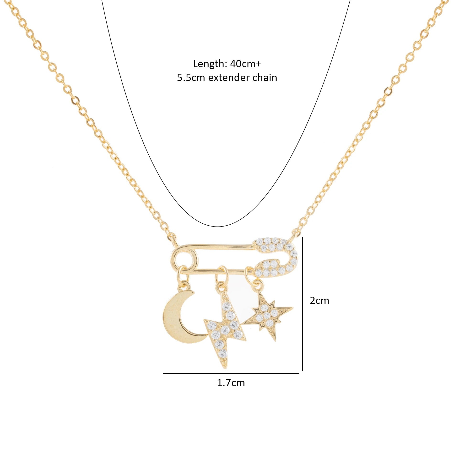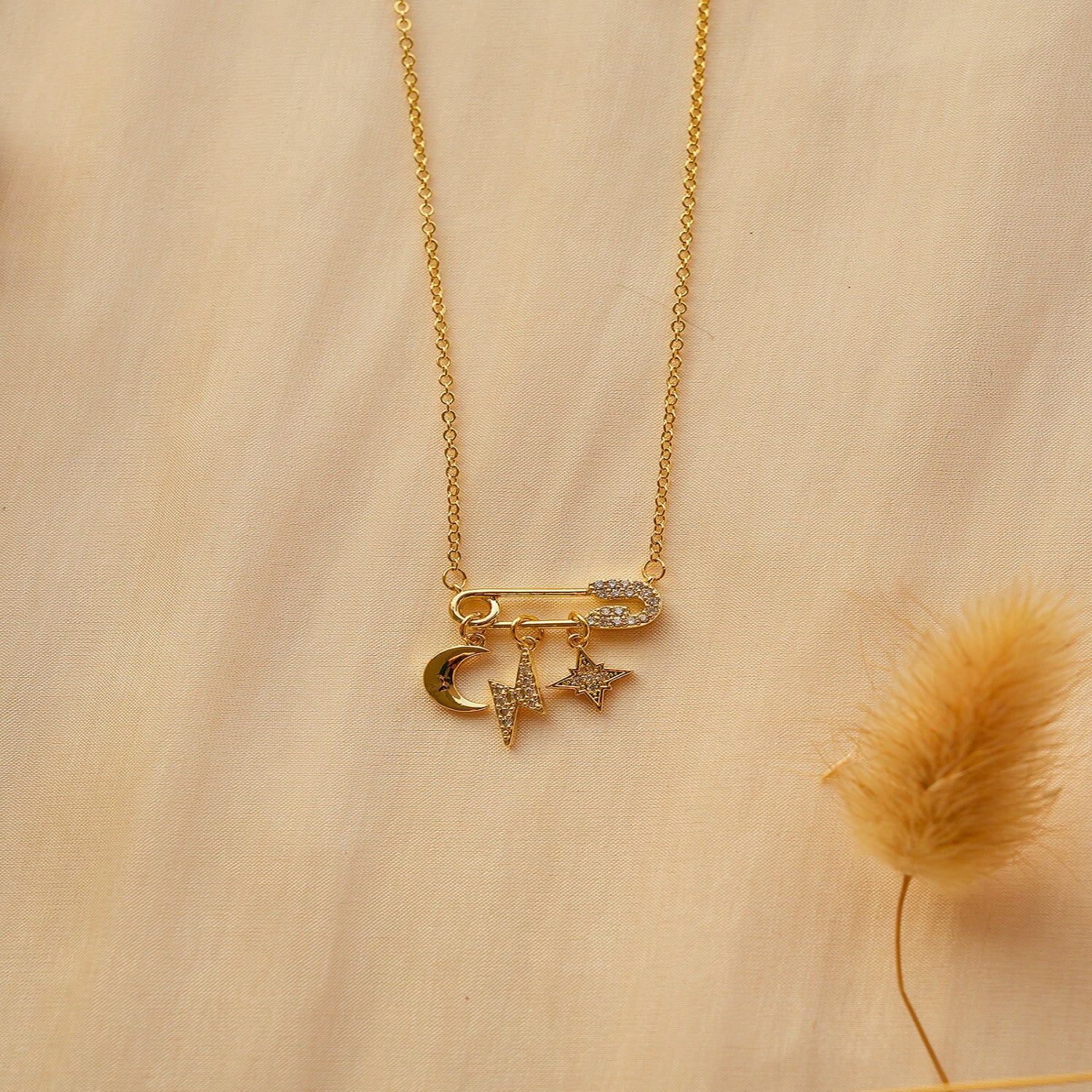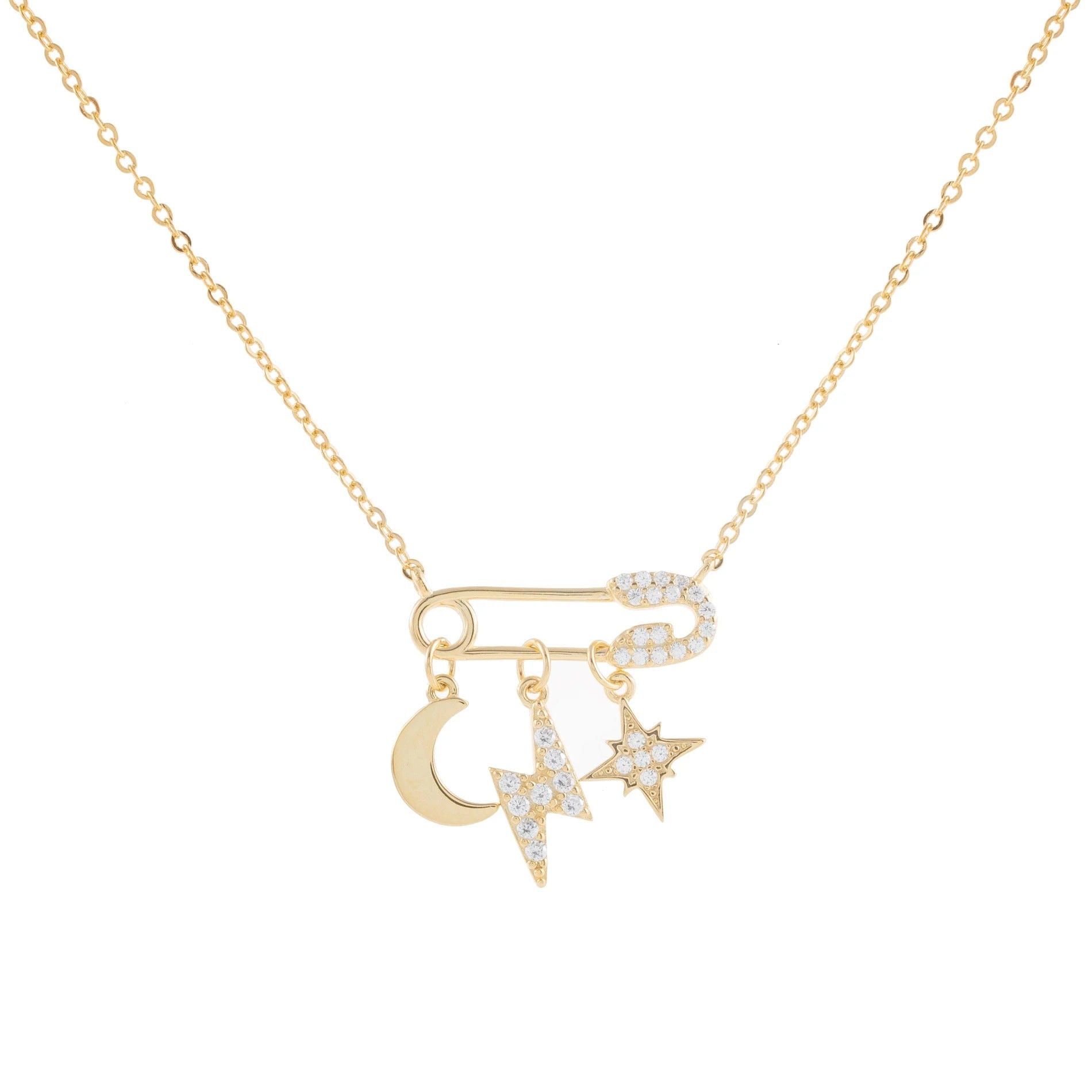 Chic and edgy, this gold necklace features a playful safety pin pendant adorned with sparkling charms — a crescent moon, shooting stars, and shimmering accents. The fine chain and delicate detailing make it perfect for layering or standing out solo, adding a trendy, celestial twist to your everyday style.