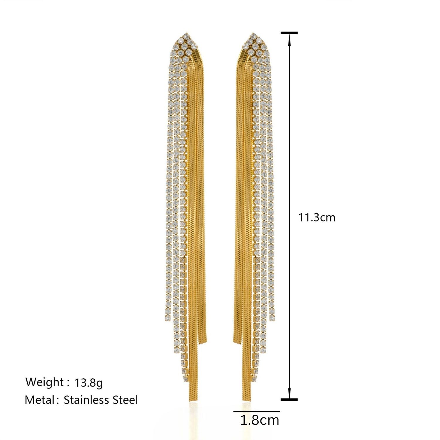 Turn heads instantly with these 18K gold plated zircon long multi-layered tassel drop earrings—a glamorous, sparkling pair perfect for parties, weddings, and evening outfits. The cascading tassels shimmer beautifully with every move, giving you a bold yet elegant statement look. Designed with waterproof and anti-tarnish plating, these earrings retain their radiance, making them ideal for long events and repeated wear.