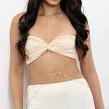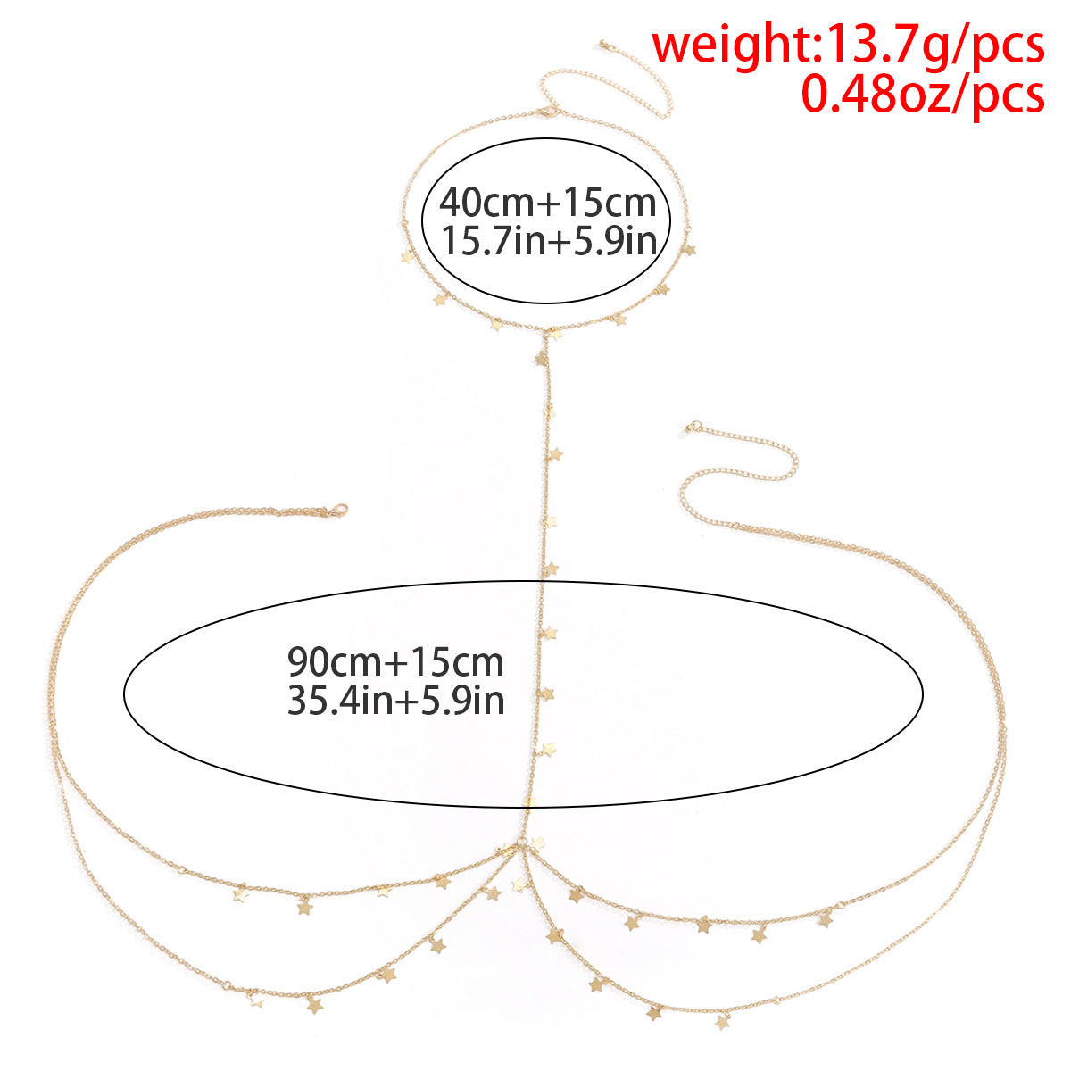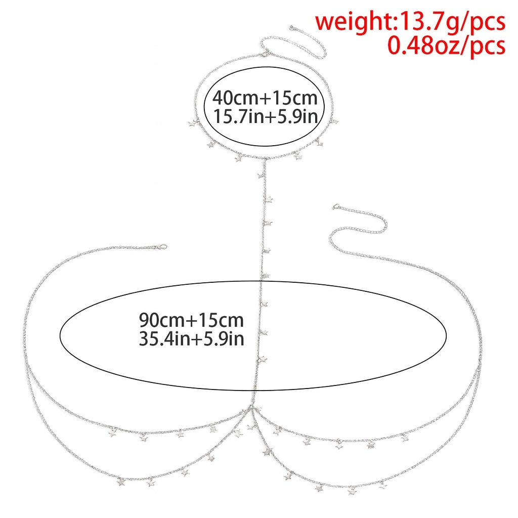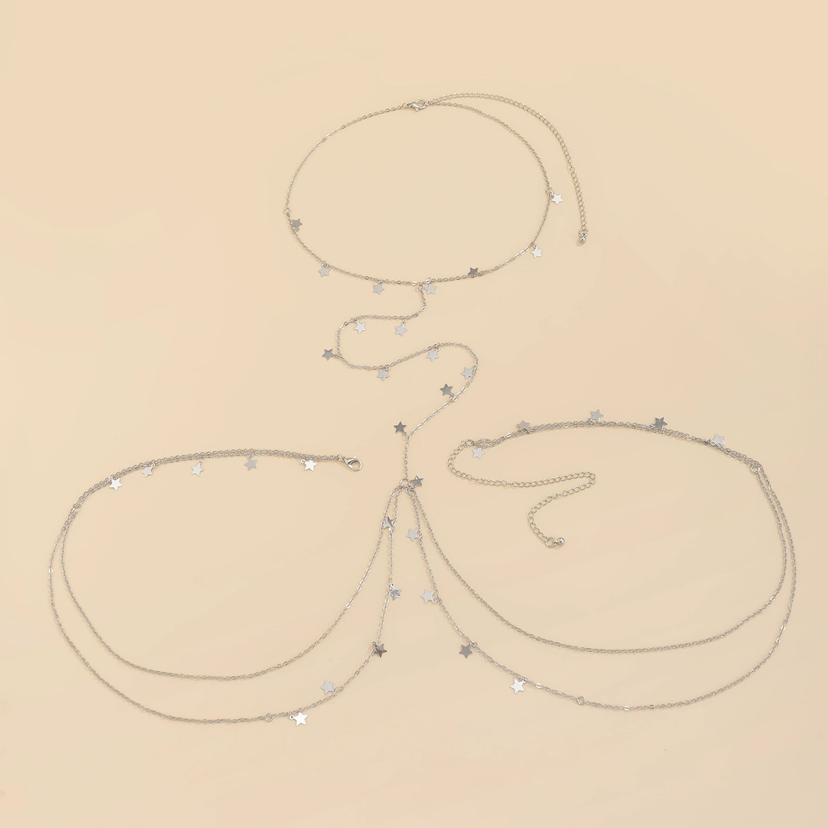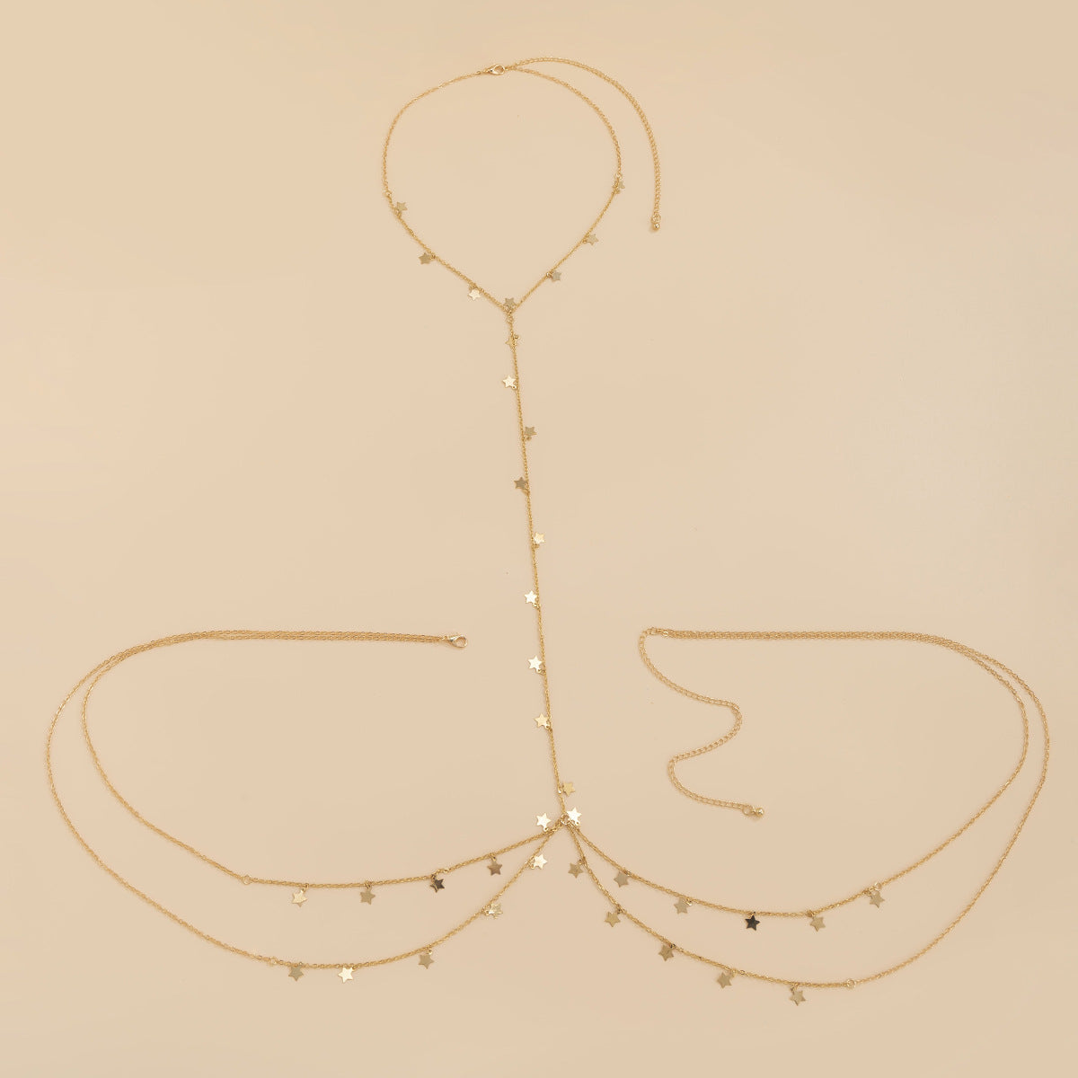 Turn heads with this layered star body chain designed to add celestial charm to your beach or party look. The delicate star motifs glimmer beautifully against the skin, making it the perfect statement piece for bikinis, crop tops, or deep-neck dresses. Lightweight and adjustable, this body chain brings effortless glamour to your vacation wardrobe.