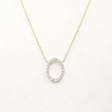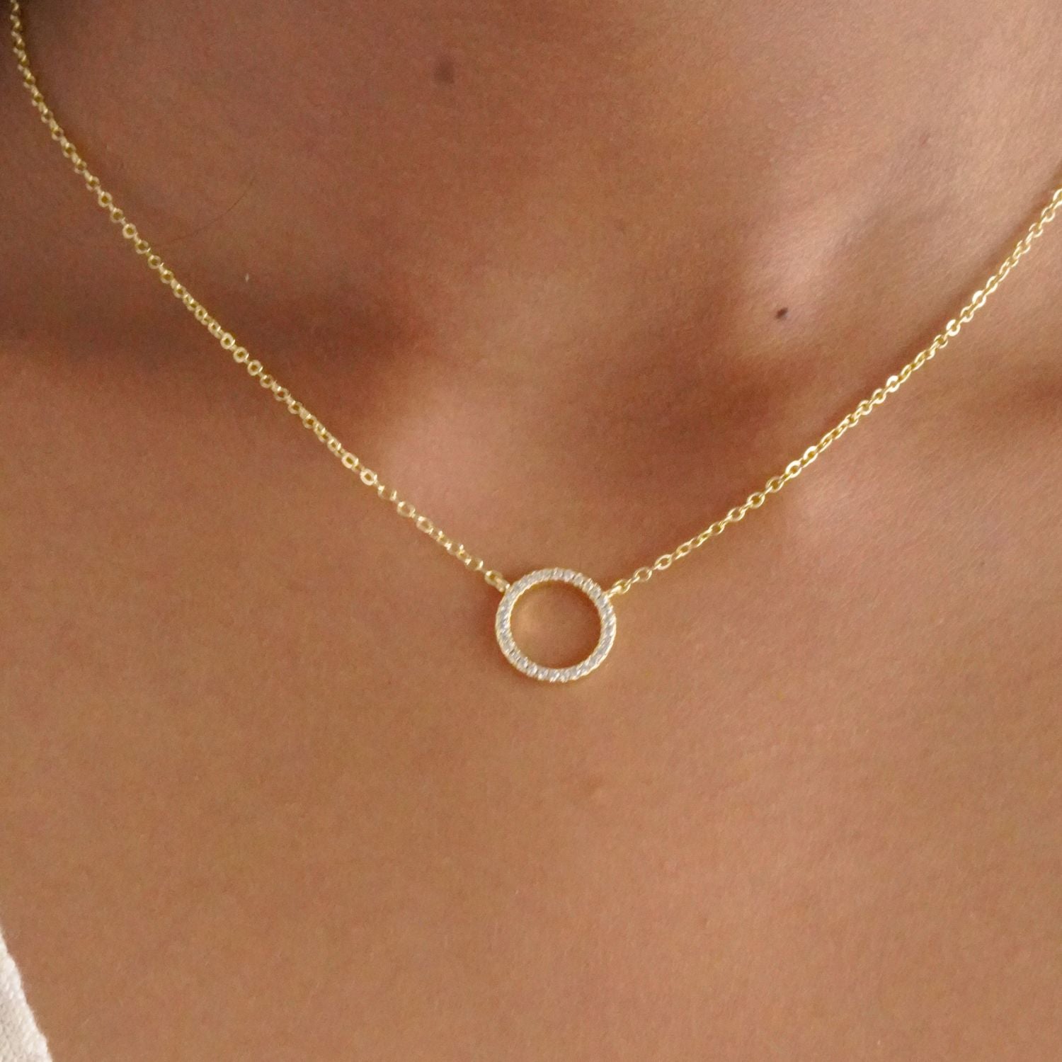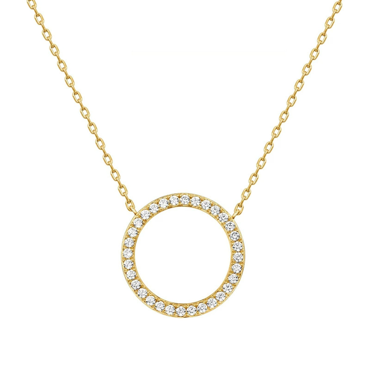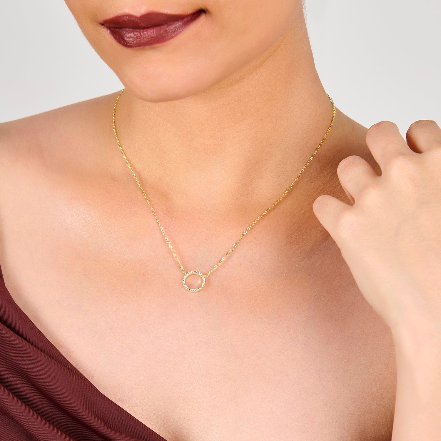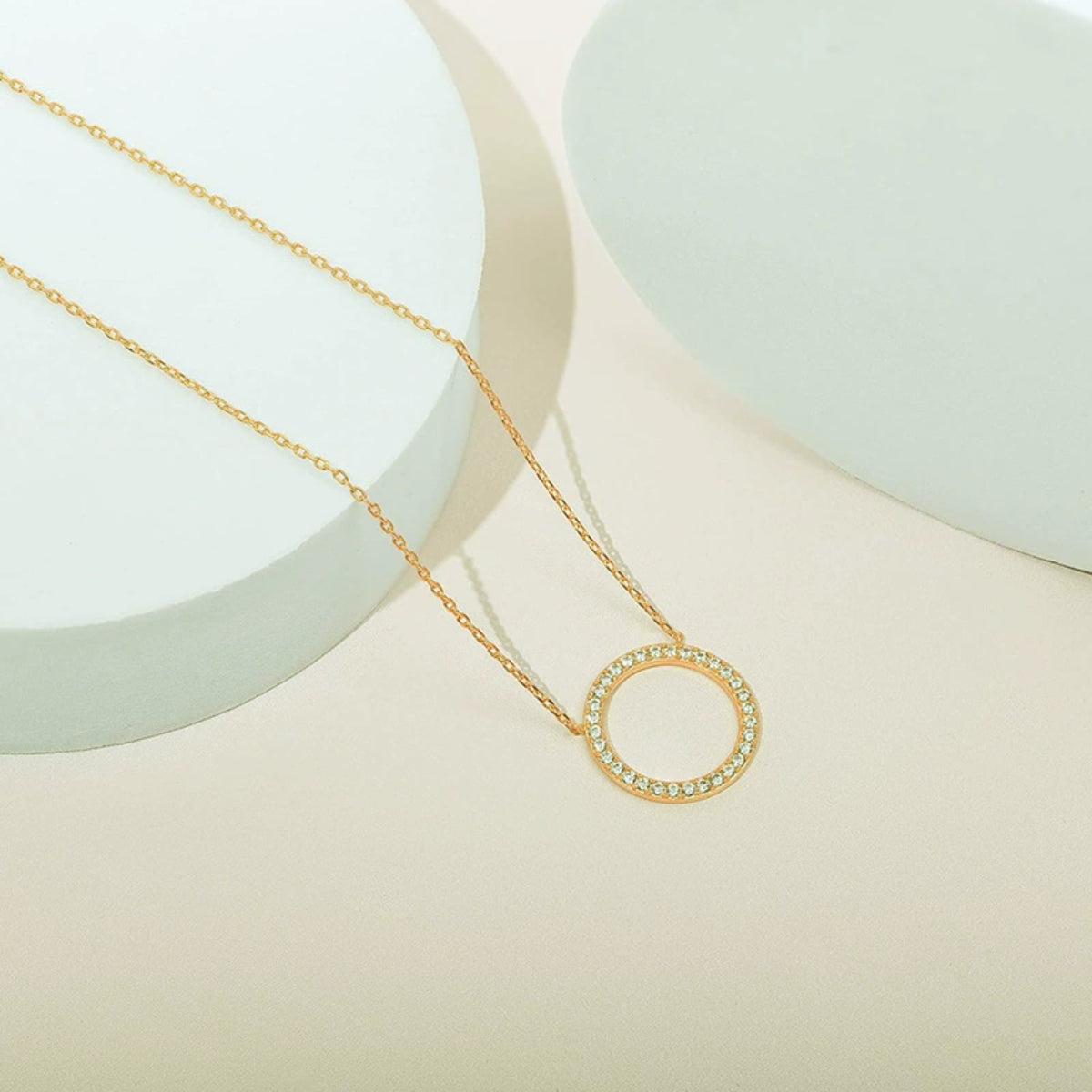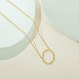A timeless circle pendant detailed with sparkling zircon stones, offering a refined touch of elegance. This necklace is designed to elevate everyday looks while adding subtle shimmer to evening wear.