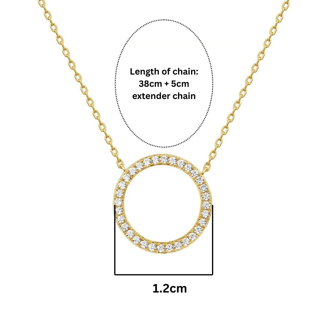 - Length: 38 cm + 5 cm extender chain, circle pendant diameter: 1.2cm