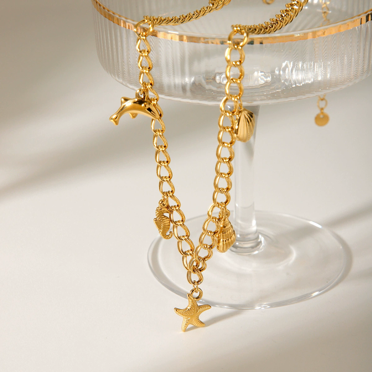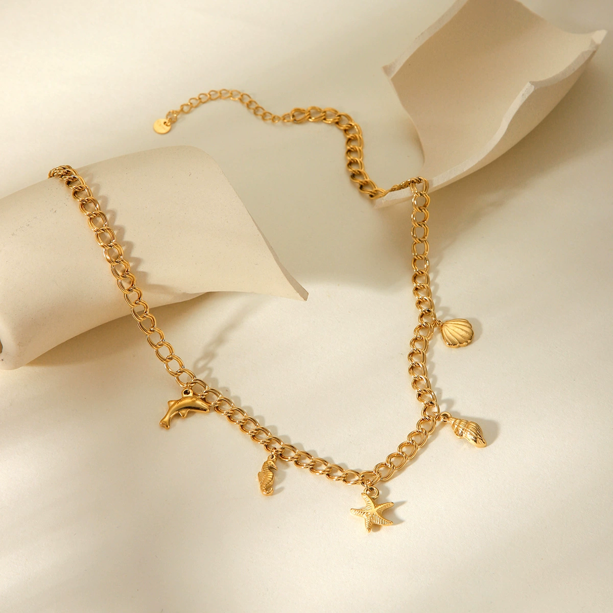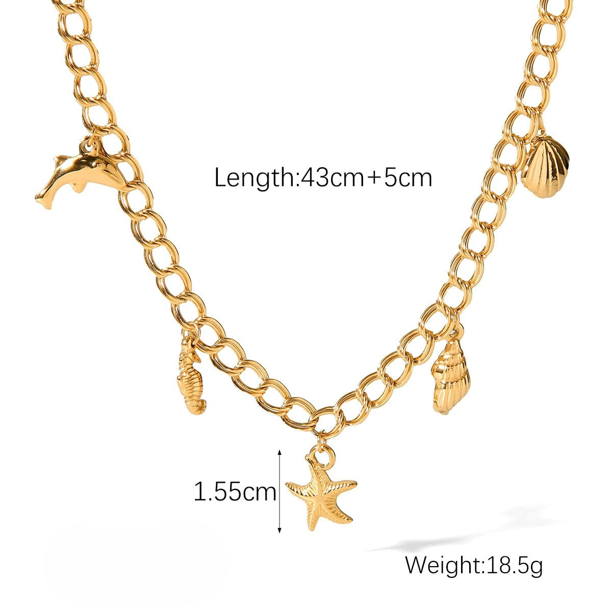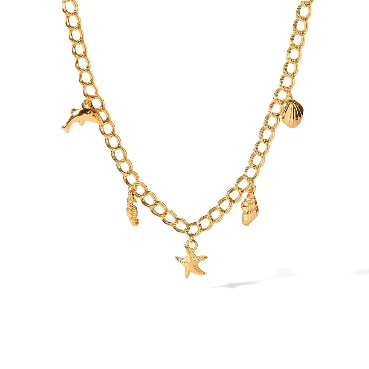 A bold gold-plated chain adorned with ocean-inspired charms including a dolphin, seashells, a seahorse, and a starfish. With its statement design and intricate detailing, this necklace brings a touch of coastal adventure to your look. Perfect for styling with both beachwear and chic city outfits, it’s a standout piece that celebrates the beauty of the sea.