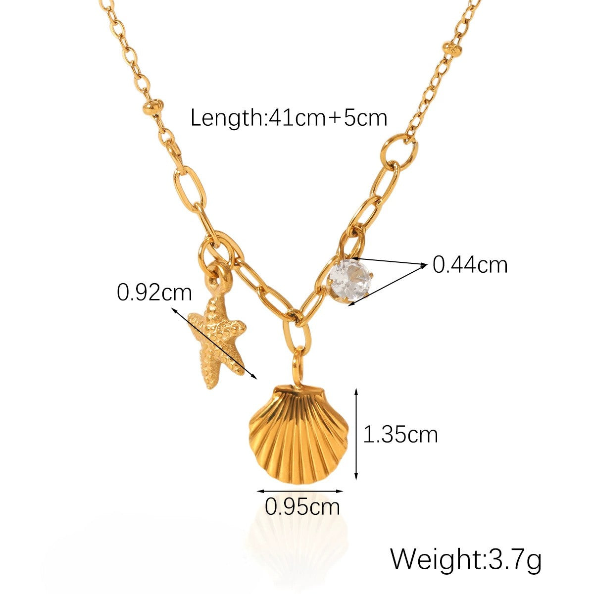 - Length of necklace: 41cm + 5cm extender chain, shell: 1.35x0.9cm, starfish: 0.9cm, zircon: 0.4cm