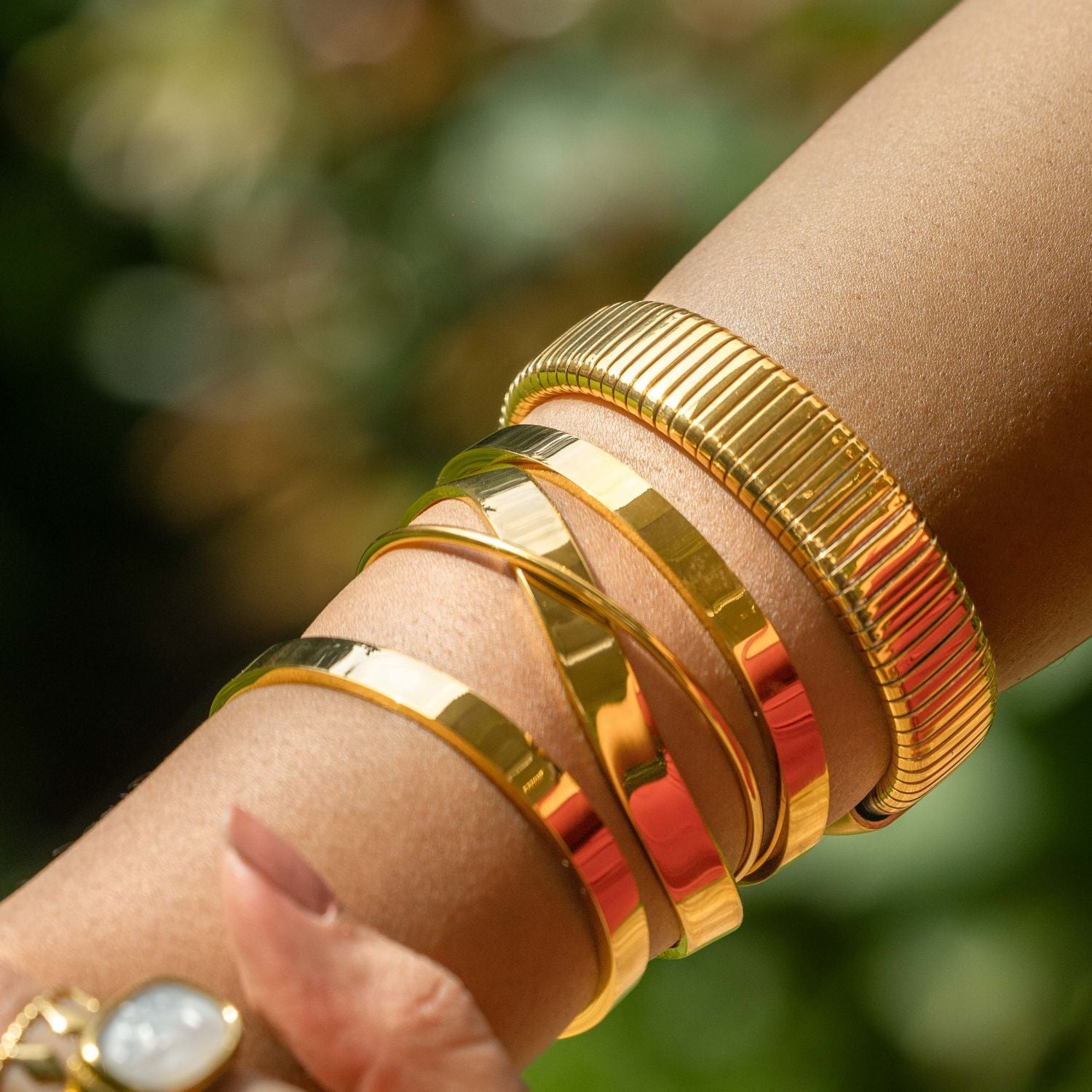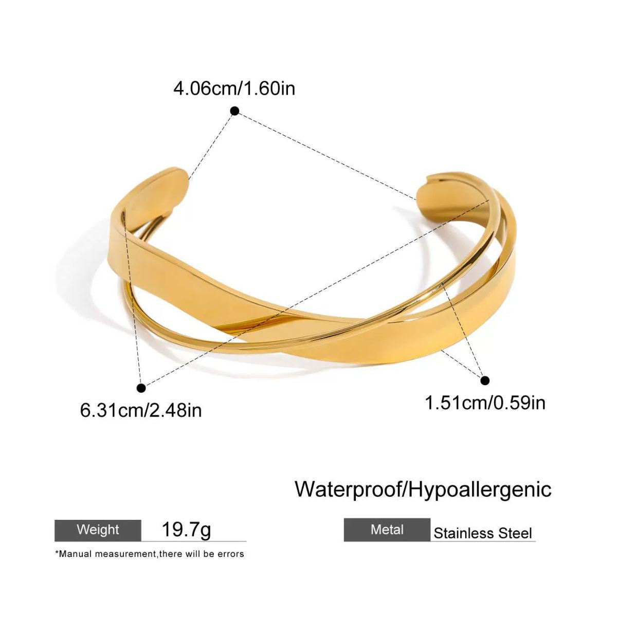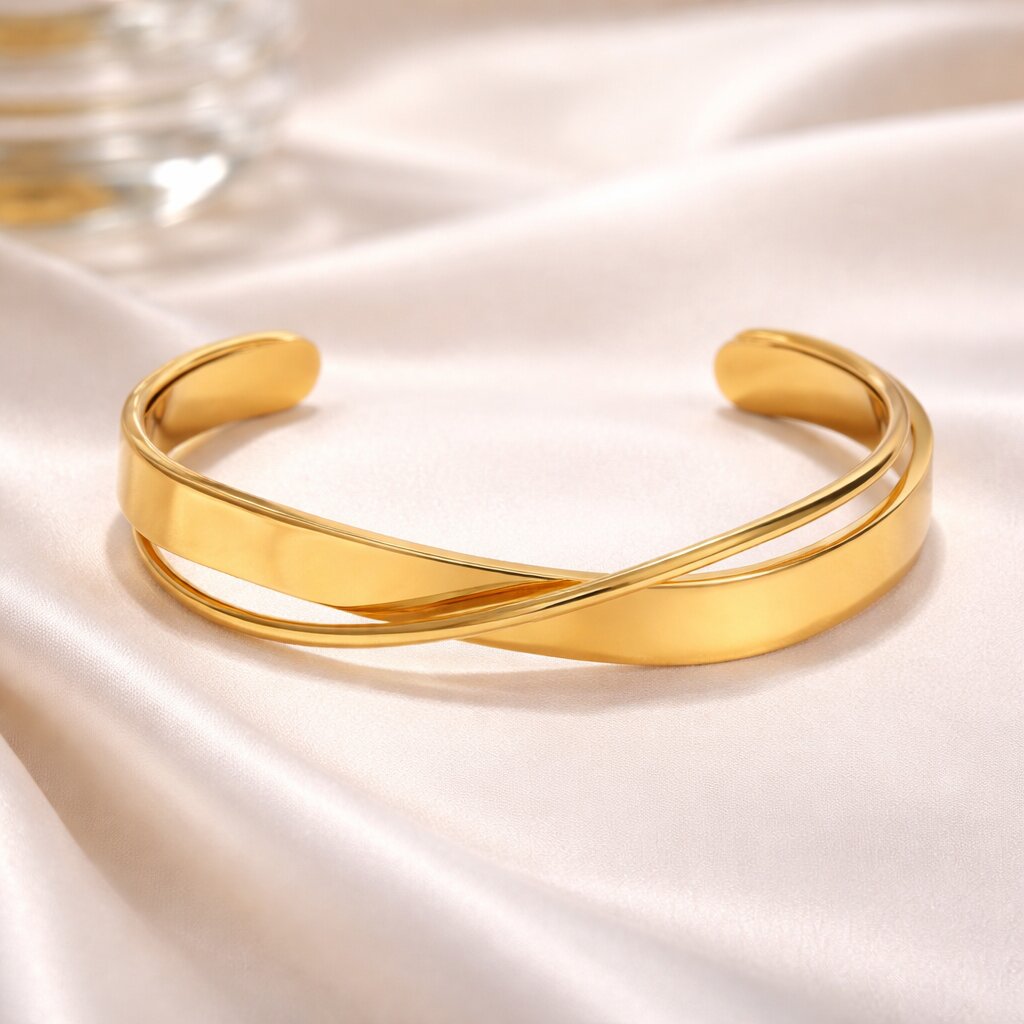The Serene Wave Cuff features a fluid, overlapping design that mirrors the graceful movement of flowing water. Crafted in polished gold stainless steel, this statement piece is both waterproof and hypoallergenic, combining modern elegance with everyday durability. A versatile bracelet that effortlessly elevates any look.