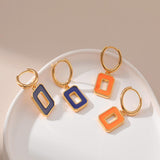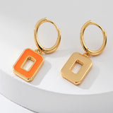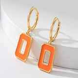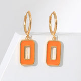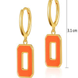 These 18K gold-plated orange square huggie drop earrings bring a modern look and complement many outfits.