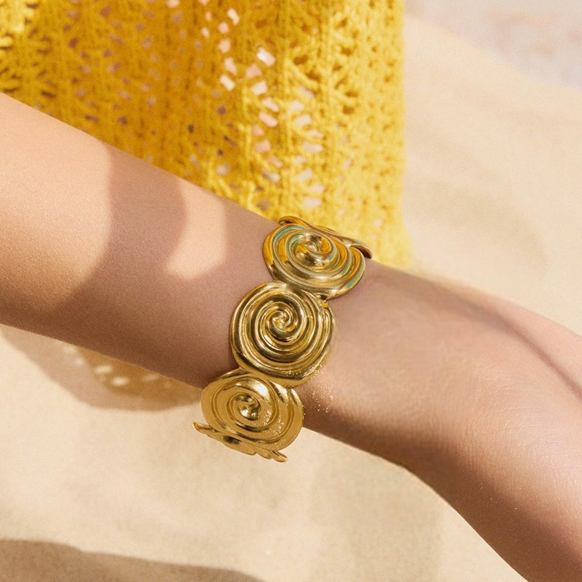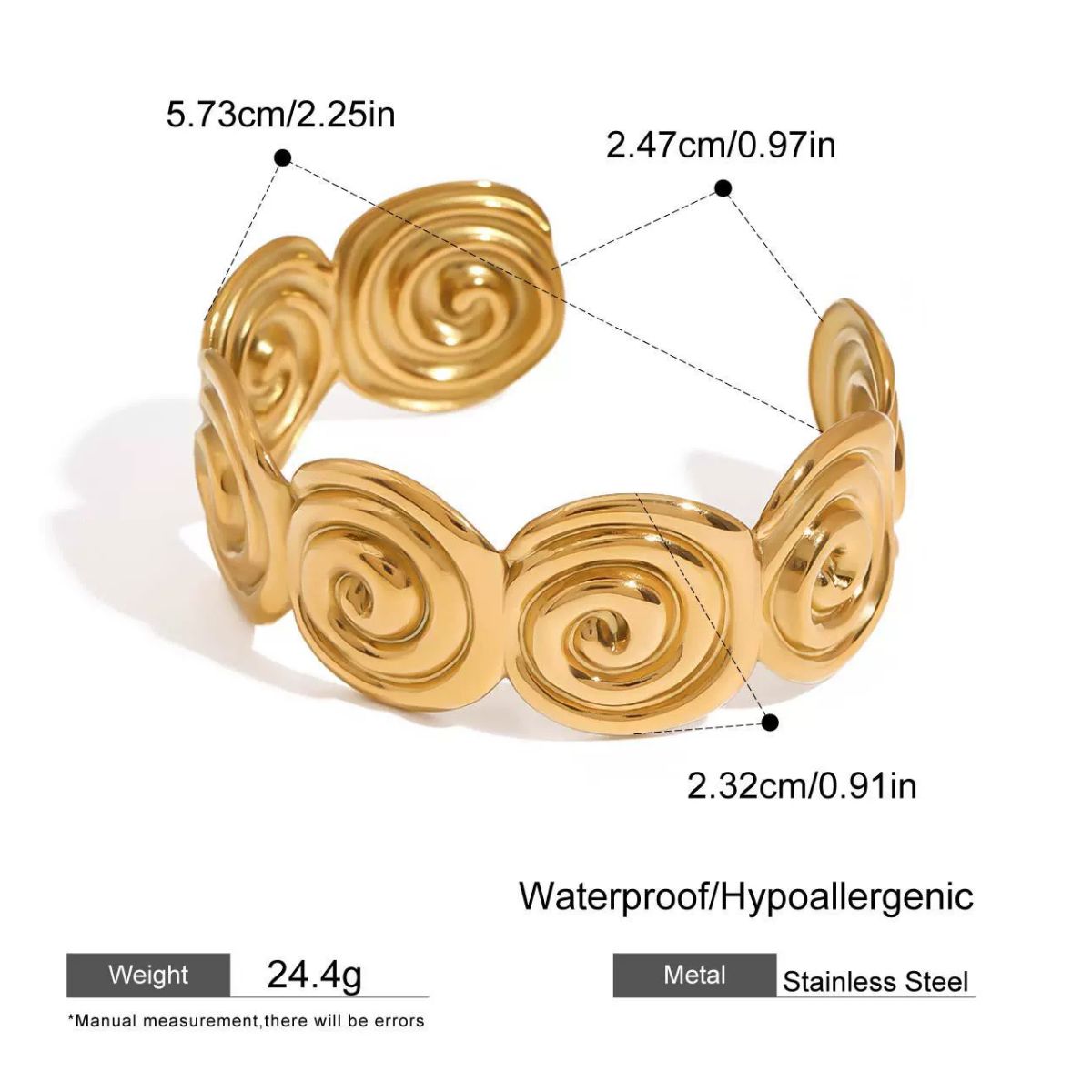 Bold and artistic, the Solaris Spiral Cuff showcases a series of swirling motifs that embody energy, movement, and creativity. Crafted in polished gold stainless steel, this waterproof and hypoallergenic design makes a striking statement while offering lasting comfort and durability. A true conversation piece that adds an artistic edge to any look.