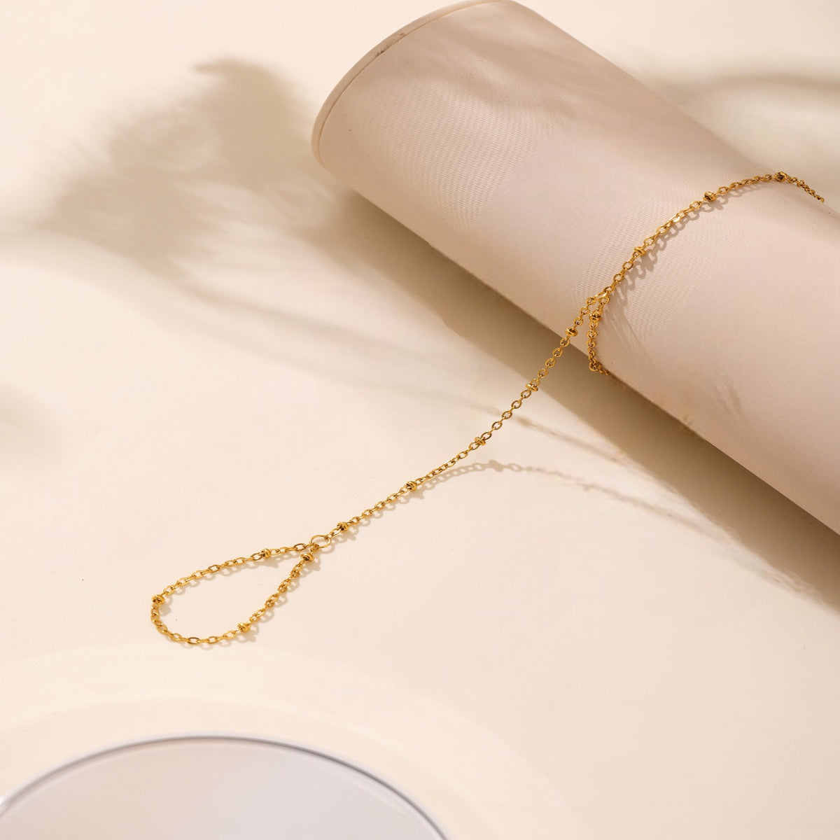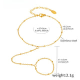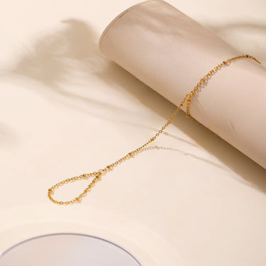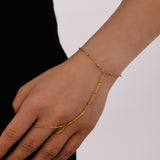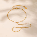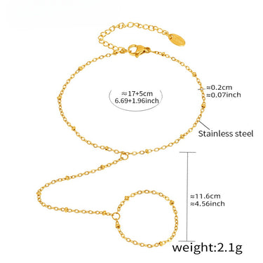 Elegant and minimal, the Soleia Chain Ring Bracelet is crafted from lightweight titanium steel and dipped in radiant 18k gold. With its fine chain looping gracefully from wrist to finger, it adds a subtle statement to your look—perfect for layering or letting it shine solo. Designed for comfort, made to enchant.