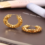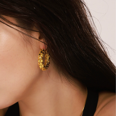 Make a bold, golden statement with the Soletta Hoop Earrings. With their hammered, reflective surface and chunky silhouette, these hoops are the perfect mix of rustic glam and runway edge. Crafted from titanium steel, vacuum-plated with three layers of 18K gold for lasting shine and durability. Lightweight despite their volume, they add a pop of texture and shine to everything from structured blazers to breezy dresses.