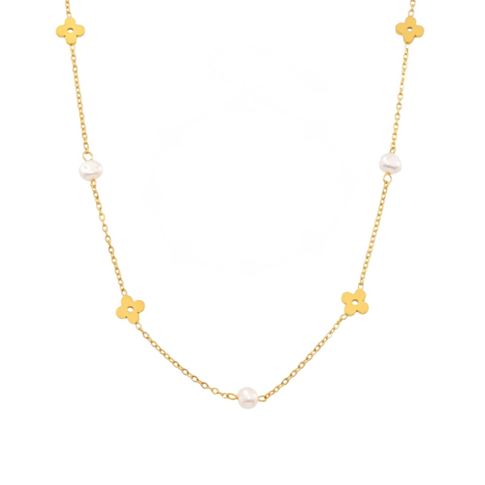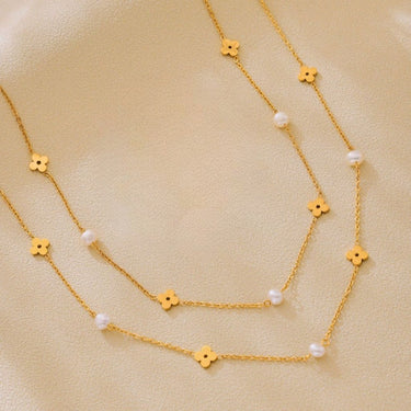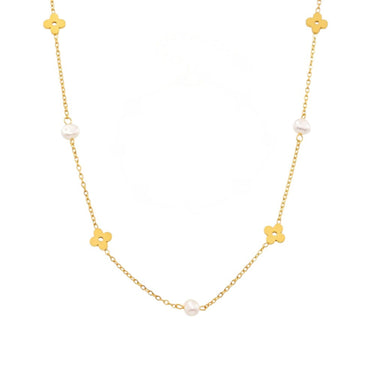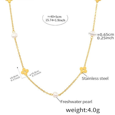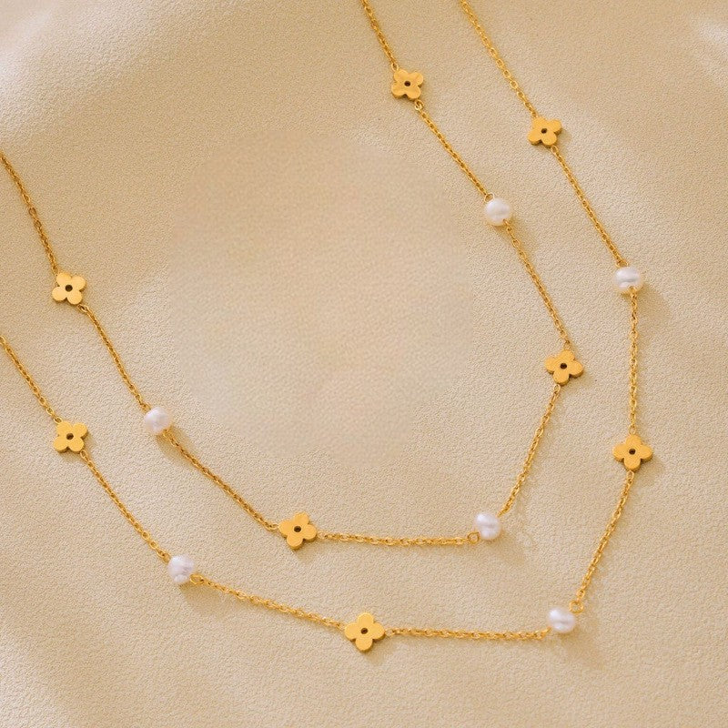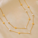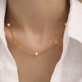 The 18K Gold Plated Clover and Pearl Charm Necklace is a dainty and elegant accessory that combines timeless elements in a modern design. Featuring delicate clover motifs paired with luminous pearl charms, this necklace exudes sophistication and brings a fresh, graceful vibe to any look. Crafted from titanium steel, vacuum-plated with three layers of 18K gold for lasting shine and durability. Its minimal chain style makes it easy to layer with other necklaces or wear solo for a classy, understated statement. A versatile and thoughtful gift choice for women and girls who love pearls, clovers, and refined jewelry pieces.