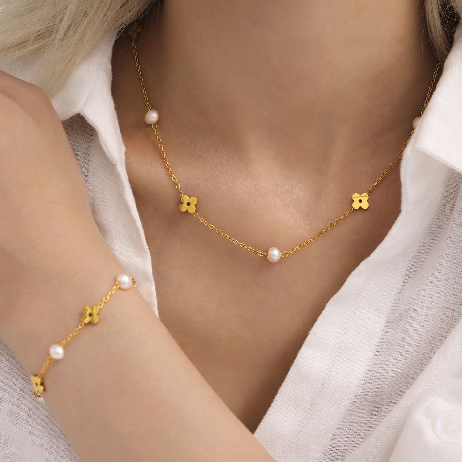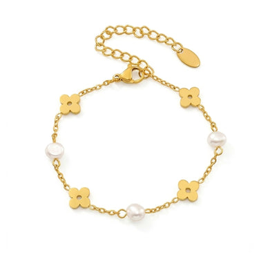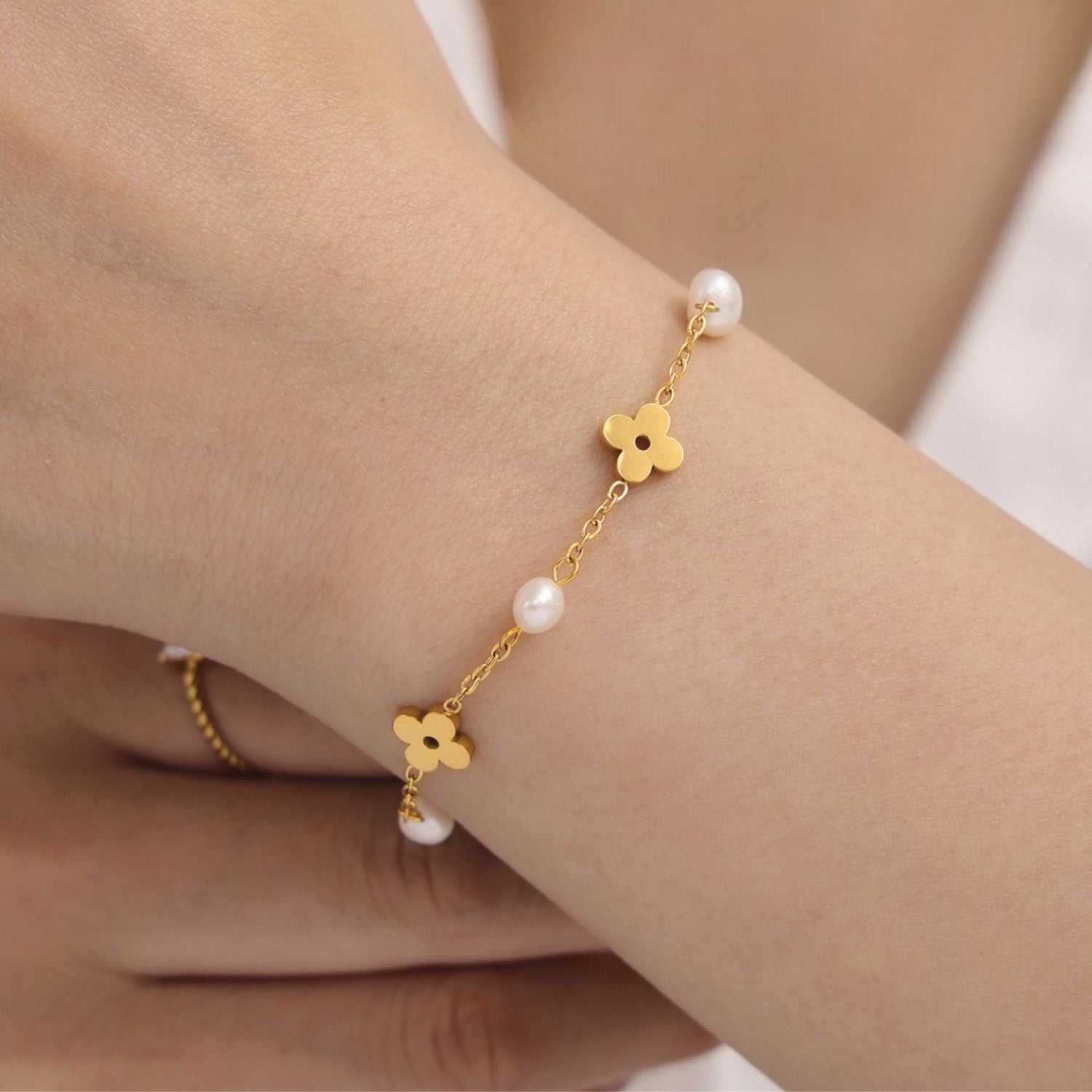 The 18K Gold Plated Clover and Pearl Charm bracelet is a dainty and elegant accessory that combines timeless elements in a modern design. Featuring delicate clover motifs paired with luminous pearl charms, this minimal bracelet exudes sophistication and brings a fresh, graceful vibe to any look. Crafted from titanium steel, vacuum-plated with three layers of 18K gold for lasting shine and durability. Its minimal chain style makes it easy to layer with other bracelets or wear solo for a classy, understated statement. A versatile and thoughtful gift choice for women and girls who love pearls, clovers, and refined jewelry pieces.