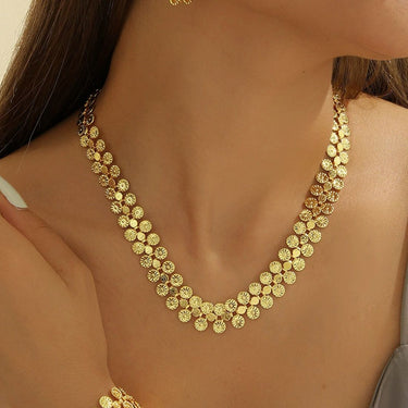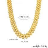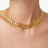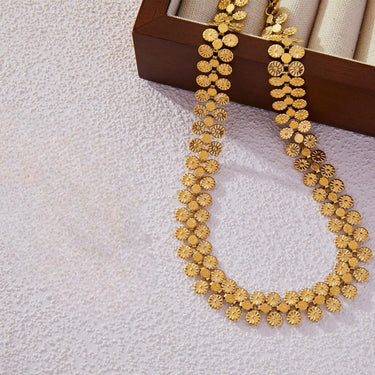 A bold blend of structure and elegance, this gold-toned necklace features repeating floral-inspired links that flow seamlessly along the collarbone. Each element reflects light with a soft gleam, creating a sense of movement and refinement. Crafted from titanium steel, vacuum-plated with three layers of 18K gold for lasting shine and durability. Whether layered over a simple neckline or paired with elevated eveningwear, it adds an unmistakable air of opulence. Designed to feel both powerful and feminine — the kind of piece that doesn’t just complete an outfit, it defines it