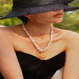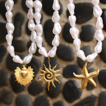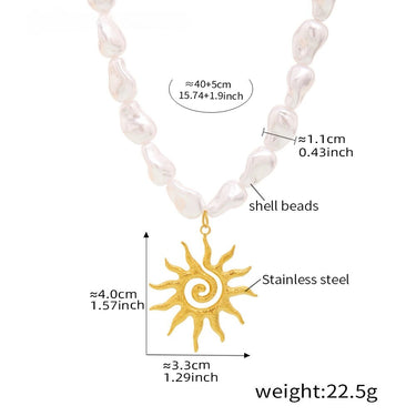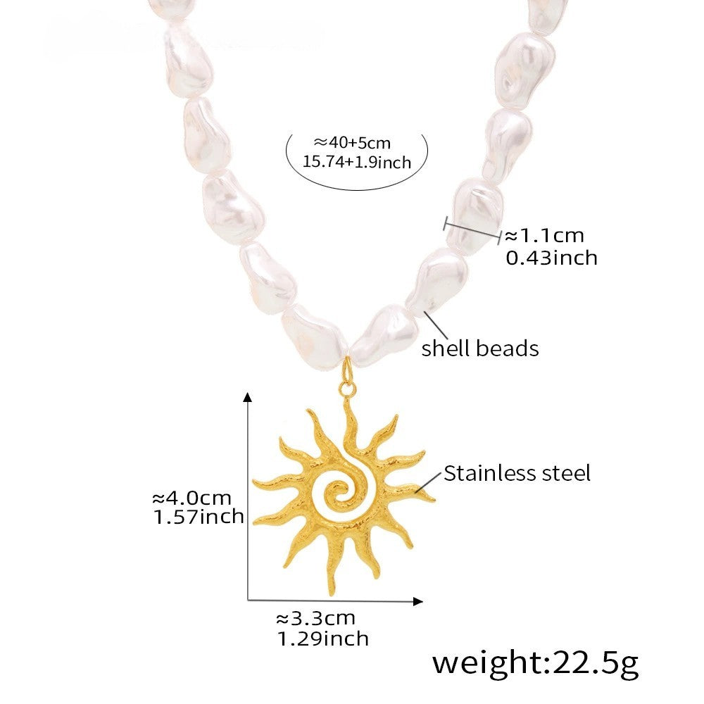 Channeling sunshine and sea, the Solmare Pearl and Sun Necklace features lustrous baroque pearl beads strung together with a bold, golden titanium steel textured sun pendant at its center. Radiant and bold, it brings a coastal charm to your look—perfect for beach days, summer getaways, or anytime you want to glow a little brighter.