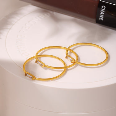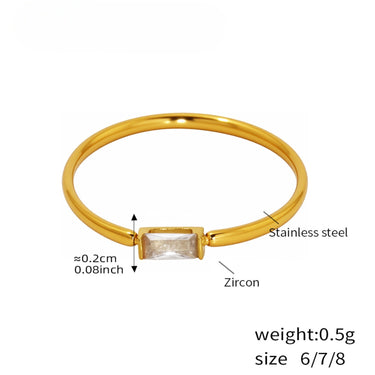 The Sorelle Zircon Ring features a sleek gold-toned stainless steel band crowned with a single rectangular-cut zircon stone. Clean, minimal, and endlessly chic, this ring is your go-to for understated elegance with a modern edge. Crafted from titanium steel, vacuum-plated with three layers of 18K gold for lasting shine and durability.