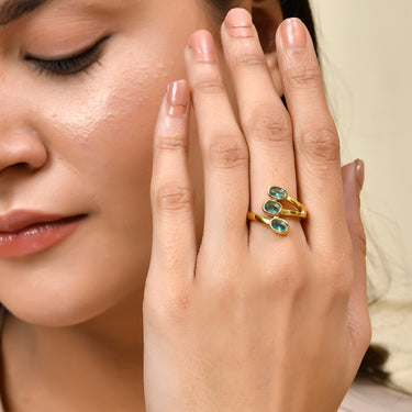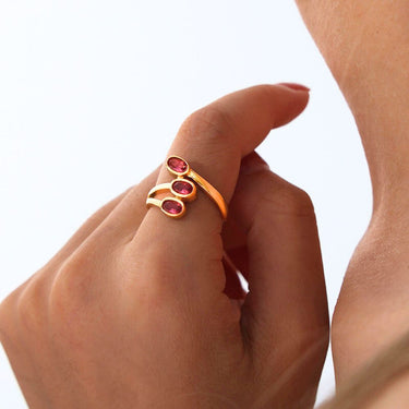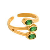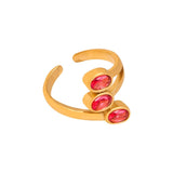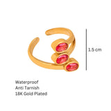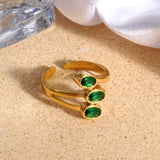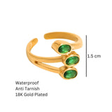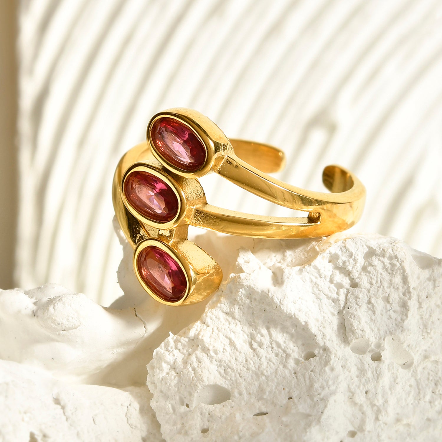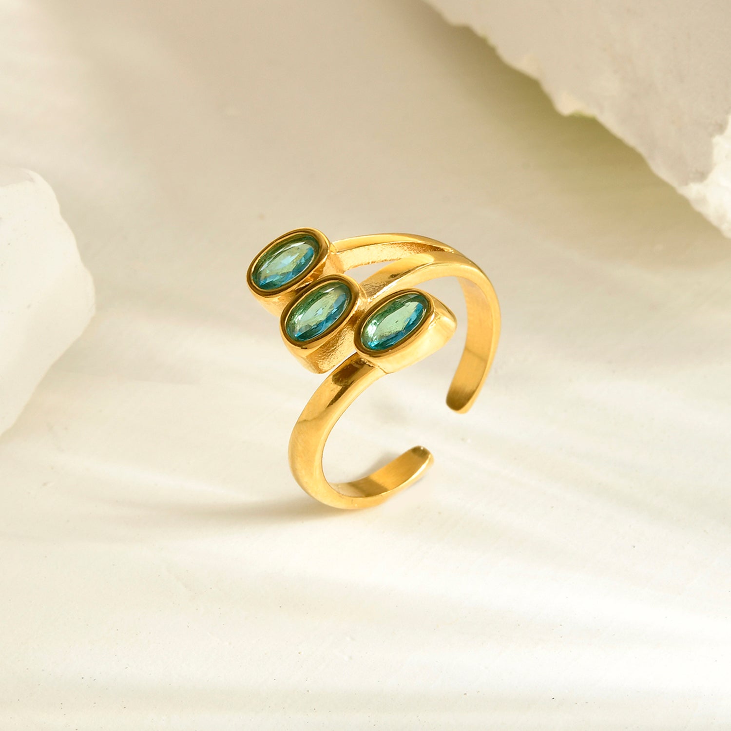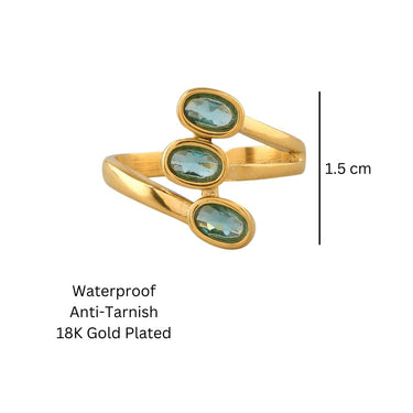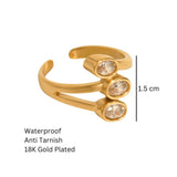 This 18K gold-plated titanium steel ring showcases three sparkling white glass stones in a modern design. It’s an elegant accessory for casual or formal occasions.