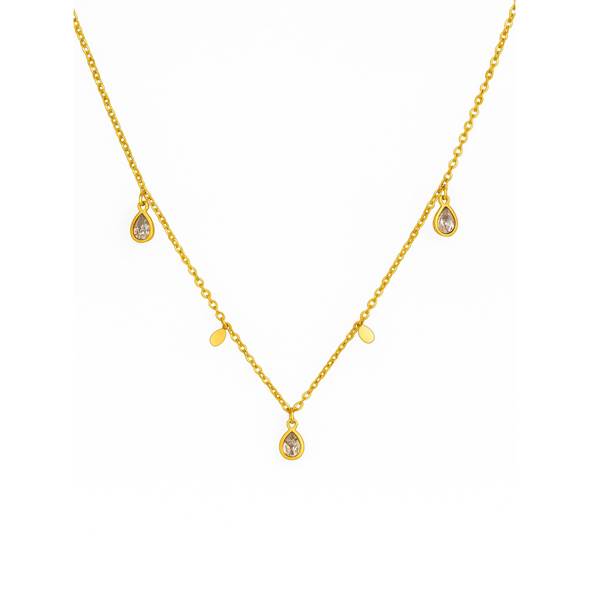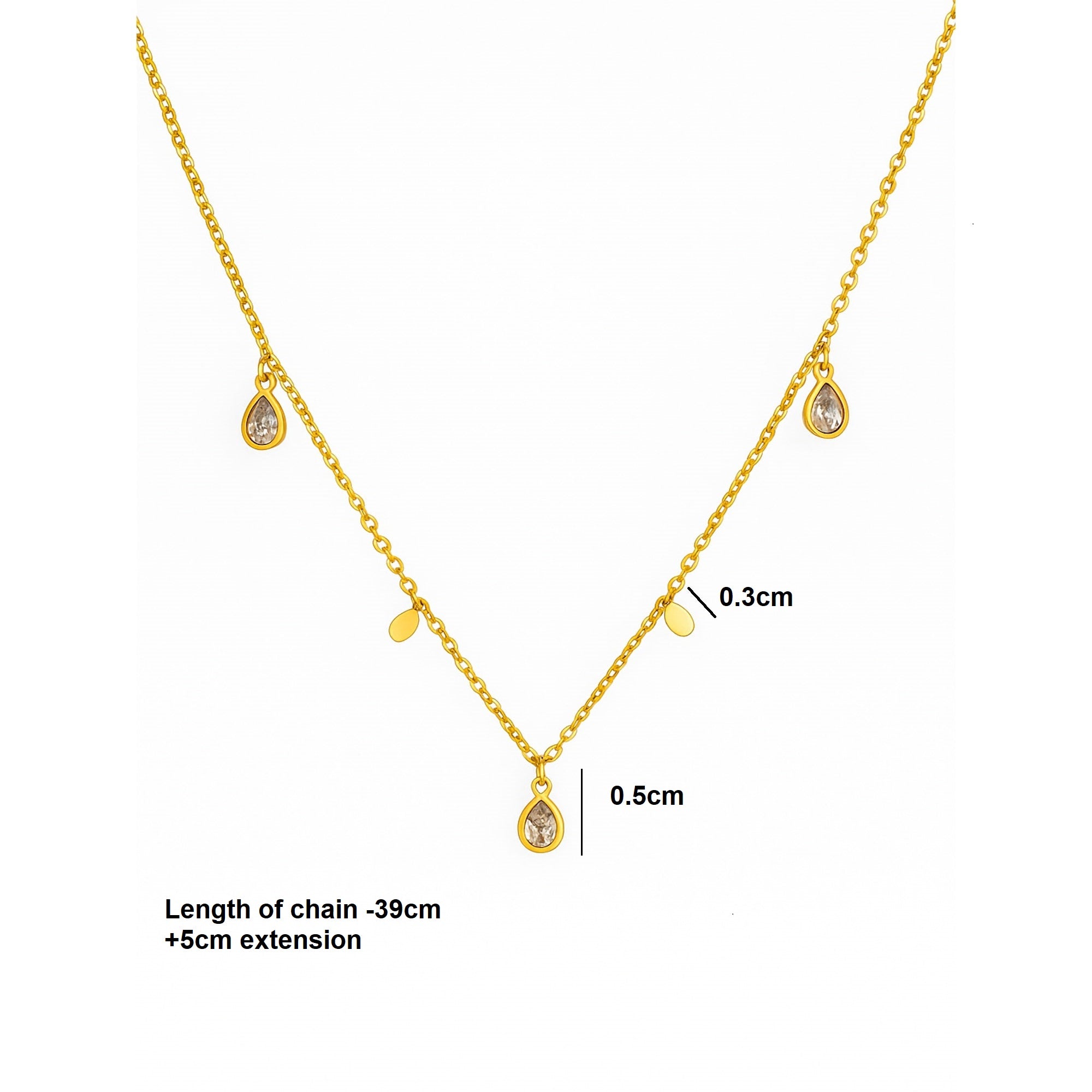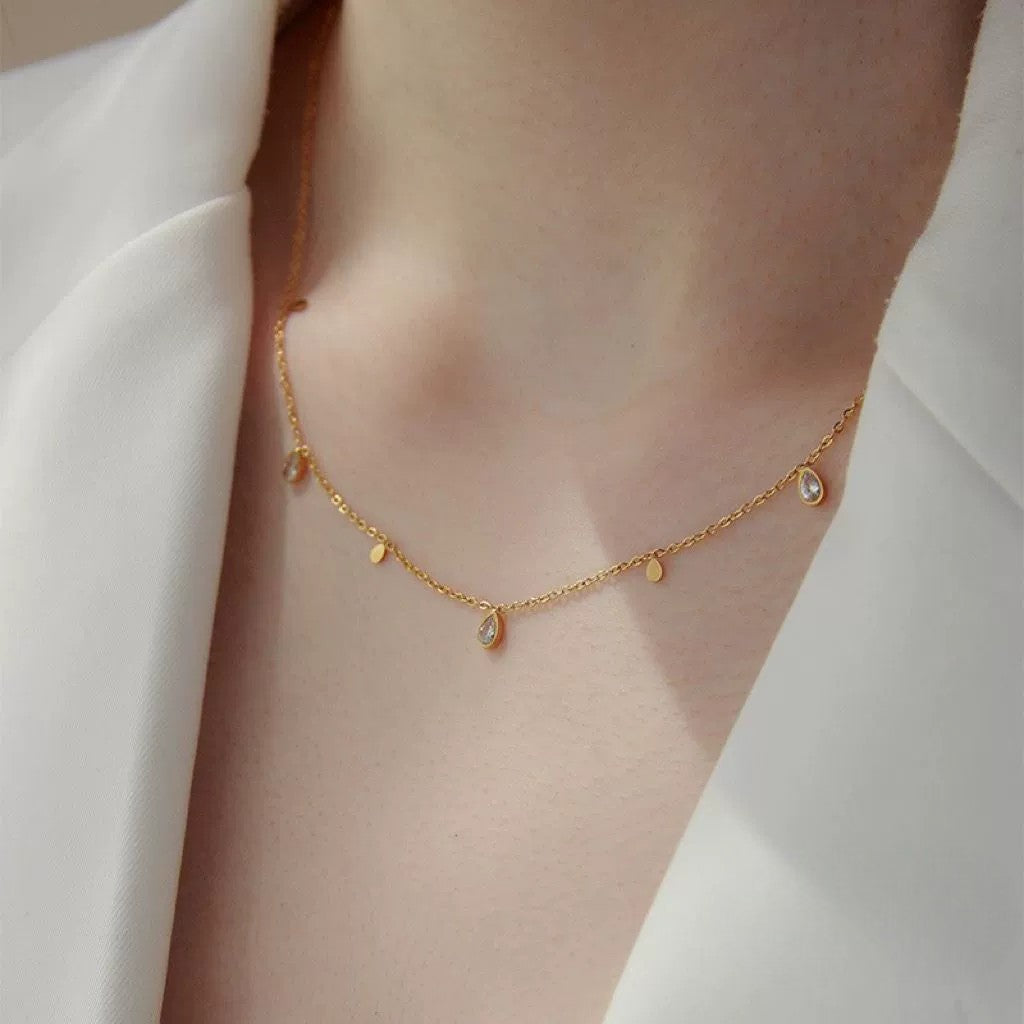 Delicate teardrops of zircon shimmer like morning dew along a fine 18K gold plated chain. Minimal yet elegant, this necklace is designed to complement both everyday outfits and special occasions. Waterproof, anti-tarnish, and effortlessly chic, it’s the perfect keepsake for women who love timeless dainty jewelry.