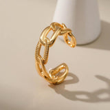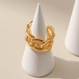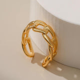 This 18K gold-plated adjustable ring has a textured link design, ensuring durability and elegance.