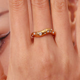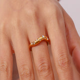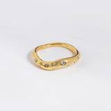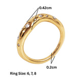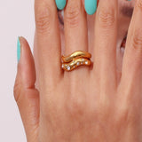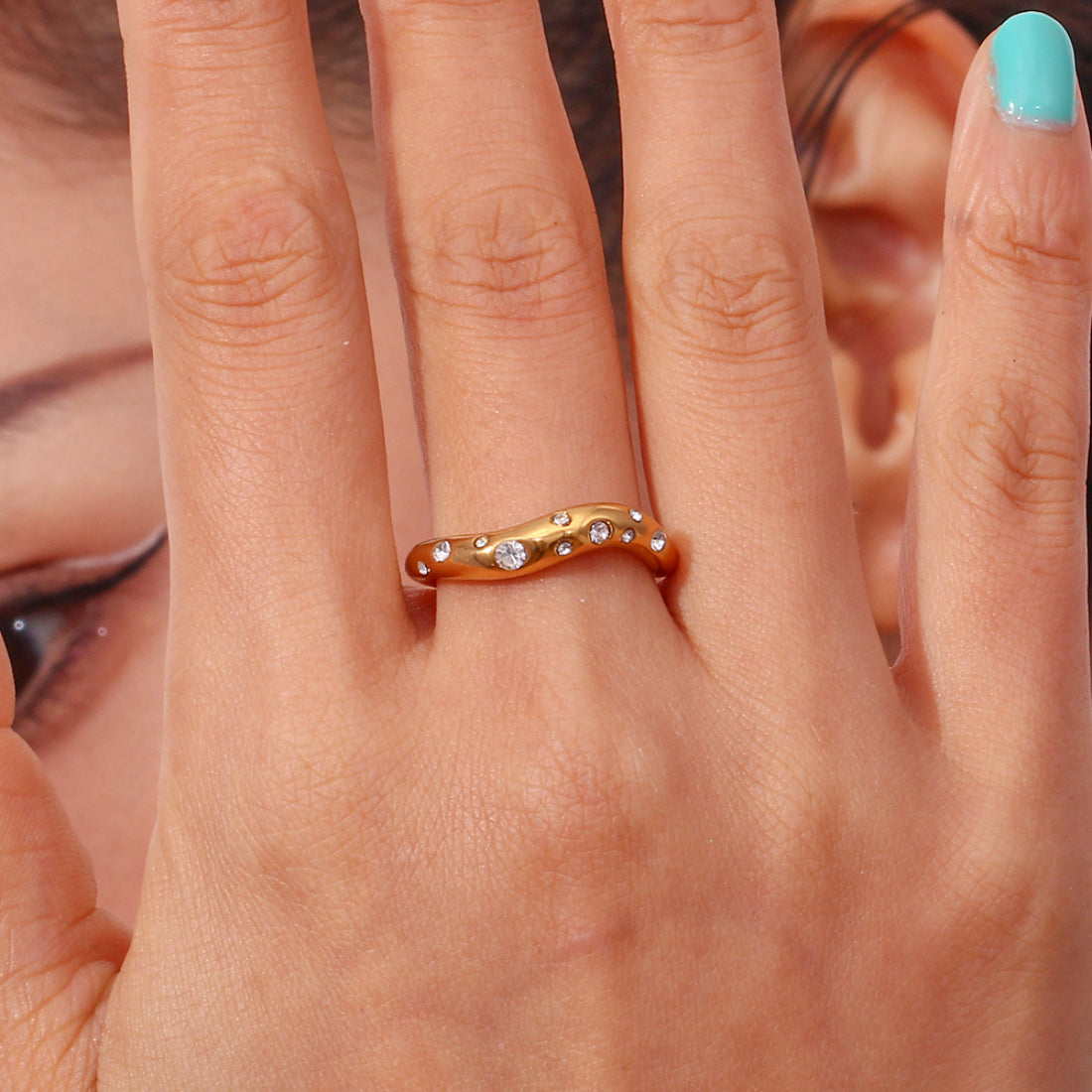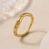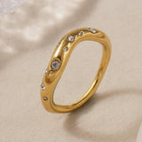 Indulge in the elegance of this 18K gold-plated wave-shaped ring with zircon, crafted from high-grade stainless steel. With a unique textured design, anti-tarnish, waterproof, and hypoallergenic properties, it offers lasting brilliance and timeless sophistication.